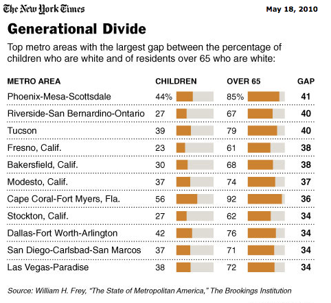 That very different makeup of the young and the old can lead to tensions. Demographers say it has the potential to produce public policy that alienates the young because older people are more likely to vote and less likely to be connected to the perspectives of youth — especially the perspectives of young people of different races and national origins...
